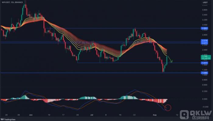 從技術(shù)角度看,WIF 的價格在日線圖上形成了 V 型復(fù)蘇模式。兩根看漲吞沒蠟燭的出現(xiàn)表明多頭市場正在主導(dǎo)價格走勢。WIF 的支撐位為1.50美元,8月5日至8月8日,相對強弱指數(shù)(RSI)從27上升至38,顯示出買家的回歸。