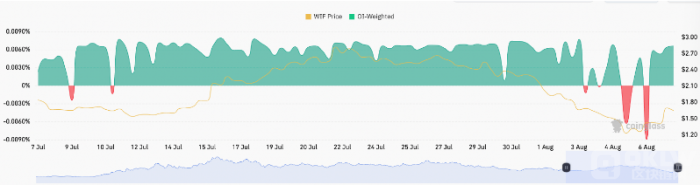 近期,WIF 的永續(xù)期貨融資利率也顯示出市場對其杠桿多頭頭寸的需求激增。根據(jù) Coinglass 的數(shù)據(jù),WIF 的融資利率在8月5日市場大跌后曾跌入負值區(qū)域,但現(xiàn)已恢復(fù)為正值。正的資金費率表明,買家正在增加杠桿,而負的資金費率通常反映出賣家在尋求額外的杠桿。
