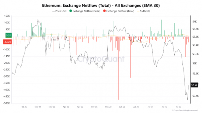 此外,Jump Trading 近期在將 ETH 轉(zhuǎn)移到交易所后,從幣安提取了3260萬(wàn)美元的 USDC,這表明該公司可能已出售了 ETH,并準(zhǔn)備從 Lido 提取剩余部分。根據(jù) CryptoQuant 的數(shù)據(jù),過去四天內(nèi),交易所繼續(xù)錄得 ETH 凈流出,表明買家正在吸收拋售壓力。
