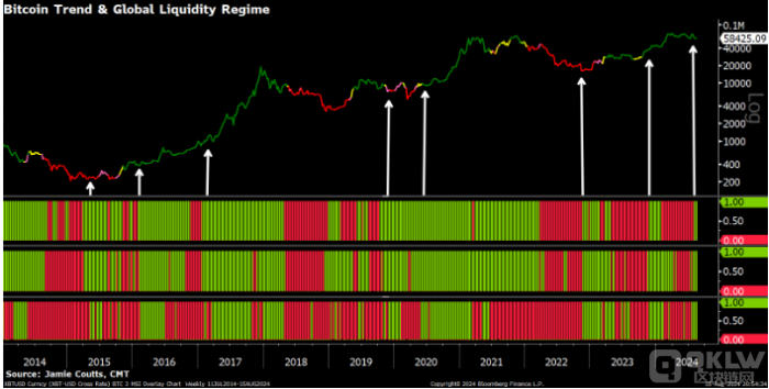 Bitcoin的技術分析顯示出一些積極的信號。RealVision Finance首席分析師Jamie Coutts指出,全球流動性動態模型(MSI)提供了一個看漲信號,這一模式類似于去年11月的情況。根據該模型,Bitcoin在11月到4月期間上漲了75%,這表明當前市場可能正在形成新的看漲趨勢。