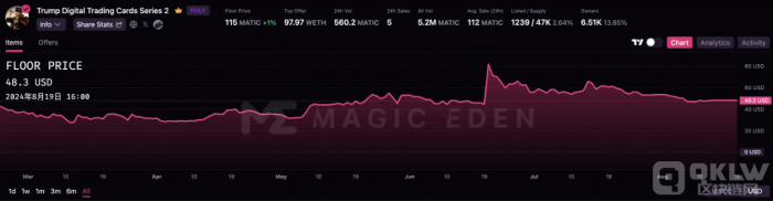 2022年12月,特朗普推出了他的第一個NFT系列“Trump Digital Trading Cards”,該系列售價每張99美元,在不到一天內便售罄。2023年,特朗普繼續推出兩個新系列NFT“Trump Digital Trading Cards Series 2”以及“Mugshot Edition”,并推出了包括特朗普晚宴、簽名紀念品等NFT權益。