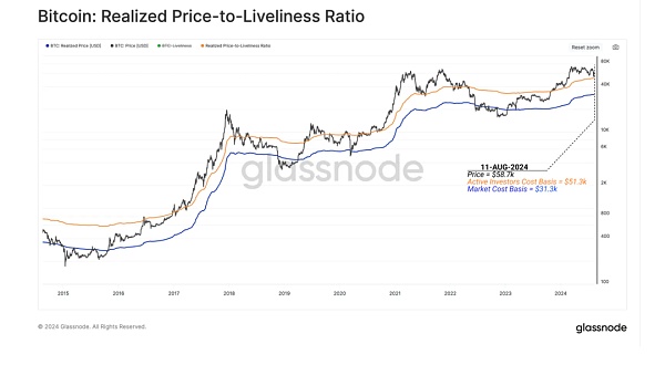 ***橙色線:實(shí)現(xiàn)價格與活躍度比率(RealizedPrice-to-LivelinessRatio,RPLR),***橙色線表示的是“實(shí)現(xiàn)價格與活躍度比率”,這是一個結(jié)合了實(shí)現(xiàn)價格和Bitcoin持有行為的指標(biāo)。它通過比較Bitcoin的“活躍度”(即Bitcoin被持有或花費(fèi)的時間)來調(diào)整實(shí)現(xiàn)價格,從而估計Bitcoin的“活躍地址的持幣成本”。