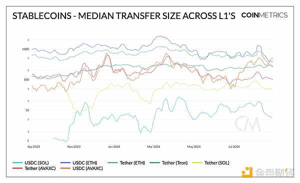 這一趨勢也反映在上圖中,該圖顯示了各主要穩定幣(USDC和USDT)在第1層上的中位轉賬規模。Ethereum上的USDC和USDT通常都顯示出較高的中位轉賬規模——盡管最近分別降至400美元和267美元——這得益于Ethereum主網費用的降低。Tron上的Tether一直保持在270美元的典型規模,而Solana的穩定幣轉賬價值最低(USDC為7美元)和(USDT為50美元)。