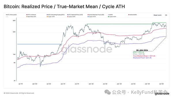新投資者持有的資產比例未達到之前幣價突破歷史新高時的峰值,這表明2024年的峰值可能更像是出現于2019年的那種中期高點,而非出現于2017年和2021年的宏觀高點。