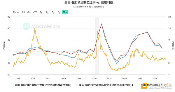 圖表:美國銀行信貸緊縮比例下降及信用利差收窄