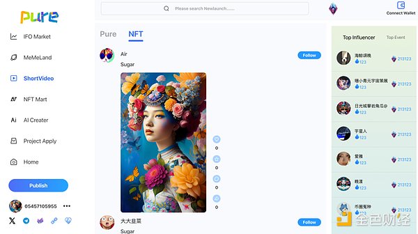 Pure不僅提供短視頻、AI創(chuàng)作和動態(tài)信息流功能,還加入了Friendtech和NFT功能。那么NFT如何融入信息流?其關(guān)鍵在于通過API服務(wù)商調(diào)取NFT元數(shù)據(jù)進行展示。如果內(nèi)容可以轉(zhuǎn)化為NFT資產(chǎn),并且具備未來現(xiàn)金流價值的可視化和量化能力,那么這種激勵模式便可行。