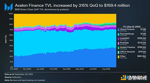 在前六大協(xié)議中,除VenusFinance外,唯一TVL有所增長的是AvalonFinance,這是一個在多個網(wǎng)絡(luò)上為基于BTC資產(chǎn)提供借貸服務(wù)的協(xié)議。AvalonFinance于5月在BNBSmartChain上推出借貸市場,并迅速獲得了8位數(shù)的TVL。7月31日,AvalonFinance被宣布為BNBIncubationAlliance第二輪的獲勝者之一,這使其快速進入了BNBChain的最有價值建設(shè)者(MVB)計劃。在這一宣布之后,AvalonFinance的TVL迅速超過1億美元,并在季度末達到1.594億美元(環(huán)比從3,840萬美元增長315%)。