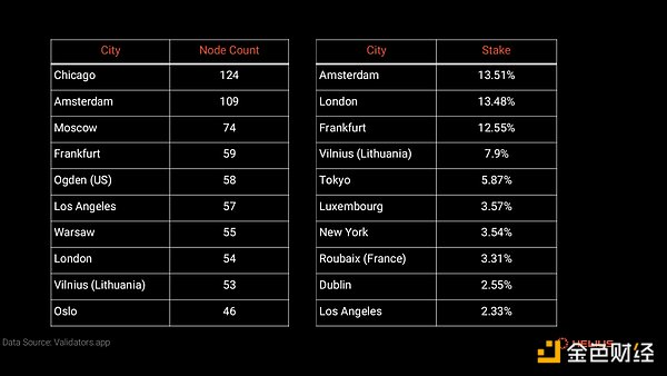 網(wǎng)絡(luò)節(jié)點(diǎn)的地理多樣性對(duì)于降低風(fēng)險(xiǎn)和提高網(wǎng)絡(luò)抗脆弱性至關(guān)重要。當(dāng)過(guò)多的驗(yàn)證者集中在一個(gè)地區(qū)時(shí),網(wǎng)絡(luò)的彈性就會(huì)依賴于這些特定司法管轄區(qū)的監(jiān)管框架。