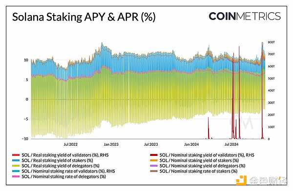 Ethereum的名義質(zhì)押收益率為3.08%(經(jīng)通脹調(diào)整后為2.73%),是鏈上經(jīng)濟(jì)的基準(zhǔn)。Solana提供更高的收益率,為11.5%(實(shí)際收益率為12.5%),但由于獎(jiǎng)勵(lì)結(jié)構(gòu)不同,委托人的收益低于驗(yàn)證者。