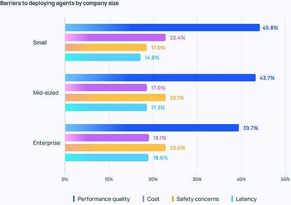 關(guān)于Agent的討論并不全是Twitter上的炒作。大約51%的受訪者目前正在生產(chǎn)中使用Agent。根據(jù)Langchain按公司規(guī)模的數(shù)據(jù),100-2000員工的中型公司在Agent投入生產(chǎn)方面最為積極,比例達(dá)到63%。
