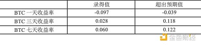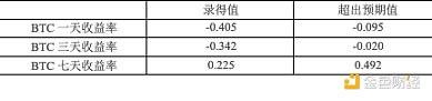 除了美聯(lián)儲(chǔ)每年8次的利率調(diào)整外,美國(guó)定期發(fā)布的宏觀數(shù)據(jù)也能反映當(dāng)前貨幣政策下的經(jīng)濟(jì)狀況,市場(chǎng)通常根據(jù)這些數(shù)據(jù)預(yù)測(cè)貨幣政策改革或經(jīng)濟(jì)周期變化,從而影響幣價(jià)。重要的宏觀數(shù)據(jù)包括美國(guó)季調(diào)后非農(nóng)就業(yè)人口變動(dòng)、初請(qǐng)失業(yè)金人數(shù)、實(shí)際國(guó)內(nèi)生產(chǎn)總值(GDP)年化季率以及核心居民消費(fèi)價(jià)格指數(shù)(CPI)月率。下表列出了2024年Bitcoin幣價(jià)在這些指標(biāo)發(fā)布當(dāng)天、三天內(nèi)和七天內(nèi)的短期收益率與各宏觀指標(biāo)的錄得值和超出預(yù)期值之間的相關(guān)性。