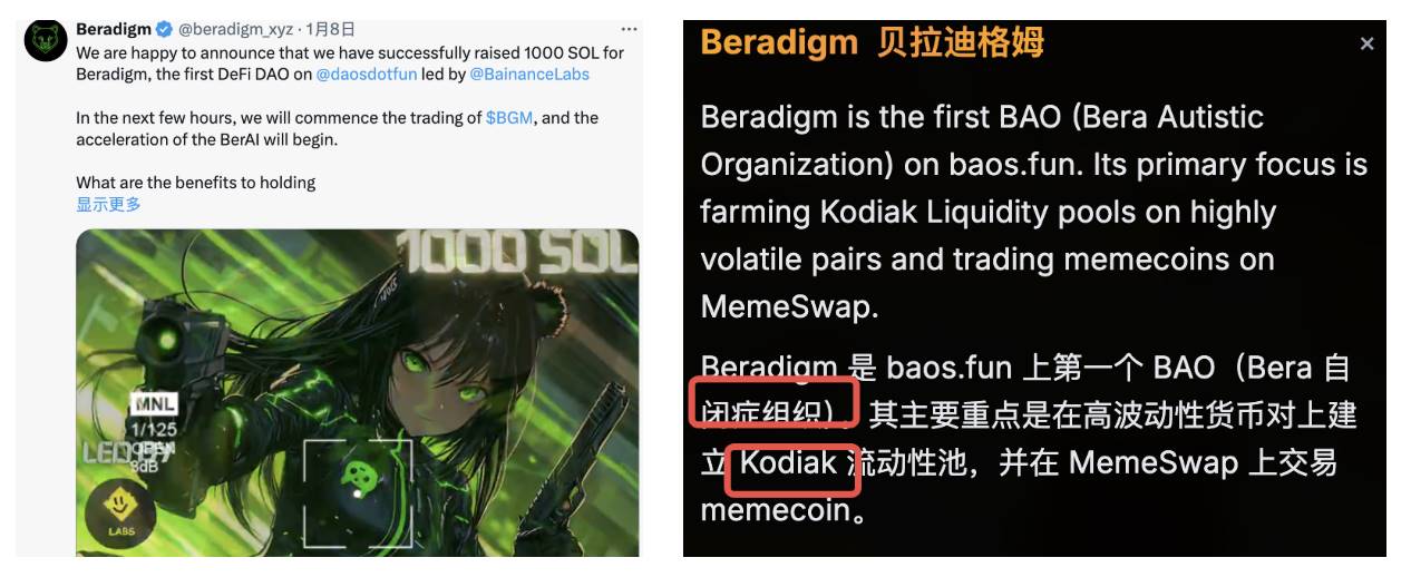 值得一提的是,在Berachain上也有個同名的Beradigim,這兩并不是同一個項目(見下圖右),但惡搞氣息同樣拉滿,自稱做了一個BAO(玩DAO的諧音),而BAO翻譯過來是「熊市自閉癥組織」;同時宣稱要建立Kodiak流動性池,而這是一種熊的品類,致敬了Berachain本身。Base生態WAICombinator:YCombinator的直接諧音版