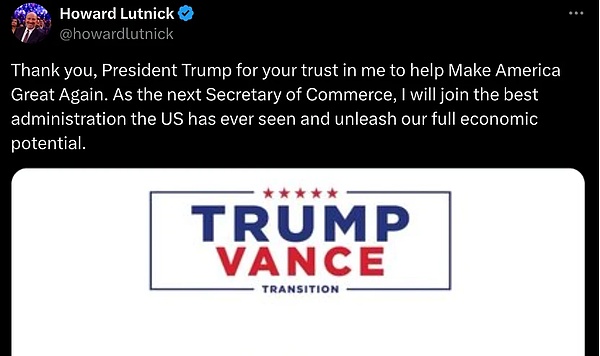 2024年11月19日,特朗普提名建達公司(CantorFitzgerald)的CEO霍華德·盧特尼克(HowardLutnick)擔任新一任商務部長。