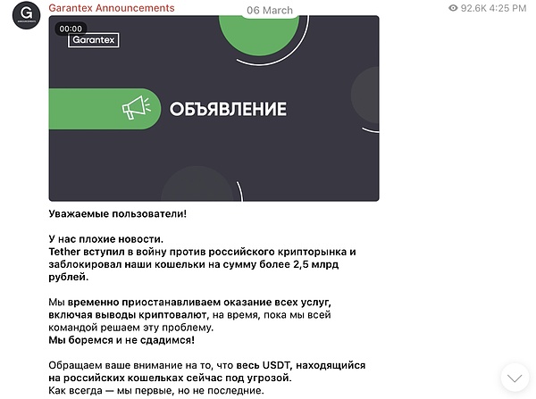 然而,隨著監管升級,制裁的力度進一步加大。2025年3月6日,穩定幣發行方Tether凍結了約2800萬美元的USDT,涉及多個Garantex關聯錢包。Garantex被迫暫停所有交易和提現,并在官網發布公告,警告俄羅斯用戶的USDT資產面臨風險。這一行動緊隨歐盟2月26日發布的第16輪對俄羅斯制裁,Garantex因與受制裁的俄羅斯銀行關系密切,被直接列入制裁名單。