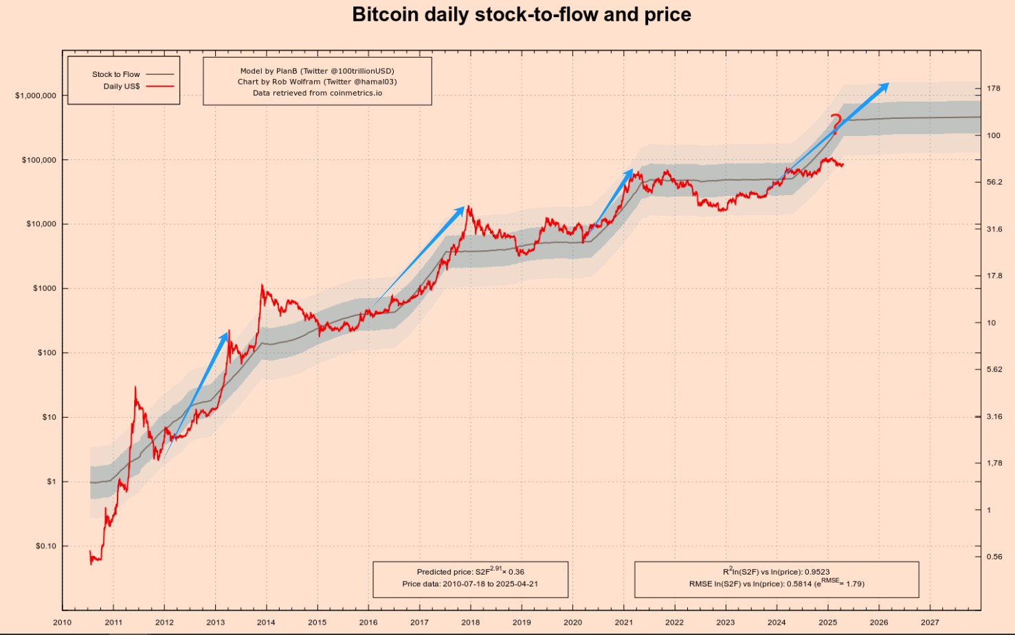 分析師PlanB提出的S2F模型(庫存/年供應量),曾多次精準捕捉減半后Bitcoin的中長期上漲趨勢——2012、2016、2020三輪減半后,價格均在12-18個月內迎來數倍增長,見下圖前三個藍色箭頭。