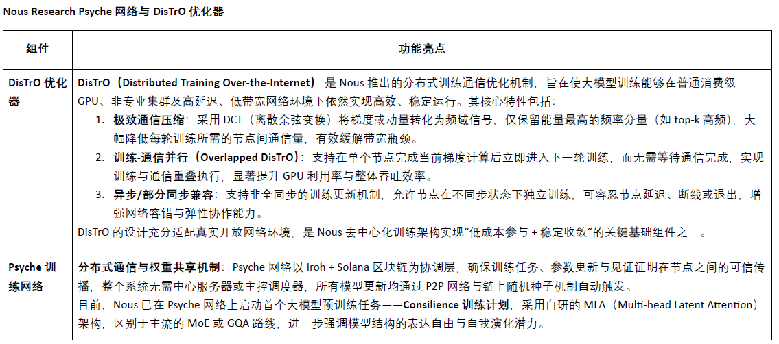 Nous對去中心化訓(xùn)練最關(guān)鍵的貢獻(xiàn),是構(gòu)建了 Psyche網(wǎng)絡(luò) 與底層通信優(yōu)化器 DisTrO(DistributedTrainingOver-the-Internet),共同構(gòu)成訓(xùn)練任務(wù)的執(zhí)行中樞:DisTrO+Psyche網(wǎng)絡(luò)具備多項(xiàng)核心能力,包括通信壓縮(采用DCT+1-bitsign編碼,極大降低帶寬需求)、節(jié)點(diǎn)適配性(支持異構(gòu)GPU、斷線重連與自主退出)、異步容錯(cuò)(無需同步亦可持續(xù)訓(xùn)練,具備高容錯(cuò)性)、以及去中心化調(diào)度機(jī)制(無需中心協(xié)調(diào)器,基于Blockchain實(shí)現(xiàn)共識與任務(wù)分發(fā))。這一架構(gòu)為低成本、強(qiáng)彈性、可驗(yàn)證的開放訓(xùn)練網(wǎng)絡(luò)提供了現(xiàn)實(shí)可行的技術(shù)基礎(chǔ)。