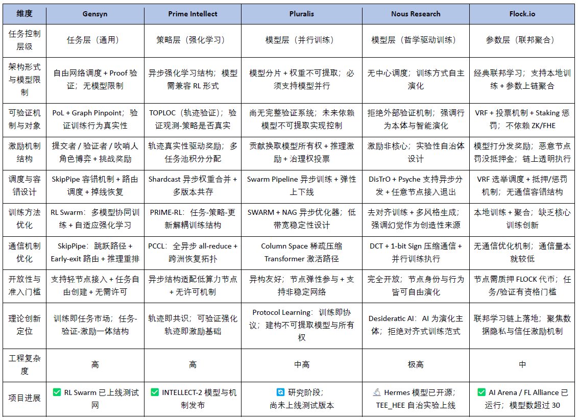以下表格基于上述指標(biāo)體系,對Gensyn、PrimeIntellect、Pluralis和NousResearch在去中心化訓(xùn)練路徑上的技術(shù)深度、工程成熟度與理論創(chuàng)新進(jìn)行了系統(tǒng)性評估。