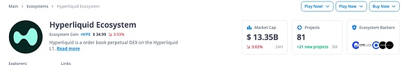 根據(jù)Cryptorank數(shù)據(jù),近3個月已有21個新項目部署在Hyperliquid上,生態(tài)總項目數(shù)量超80個,涵蓋: