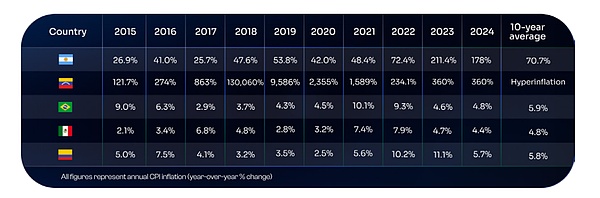 重點我們將關注拉美地區。這里加密已經扎根,已證明新型銀行可以稱王,已是穩定幣原生。拉美具備貨幣危機、僑匯依賴、金融排斥等結構性條件,使得Web3新型銀行不僅“有用”,而是“必需”。該地區每年處理數萬億美元加密交易,其中50–90%是穩定幣支付而非投機。阿根廷178%的通脹率,讓人們對美元計價賬戶求之若渴;每年1600億美元的僑匯在這片土地流動,卻被盤剝式手續費層層吸血;1.22億人仍無銀行賬戶,卻人人手握智能手機。