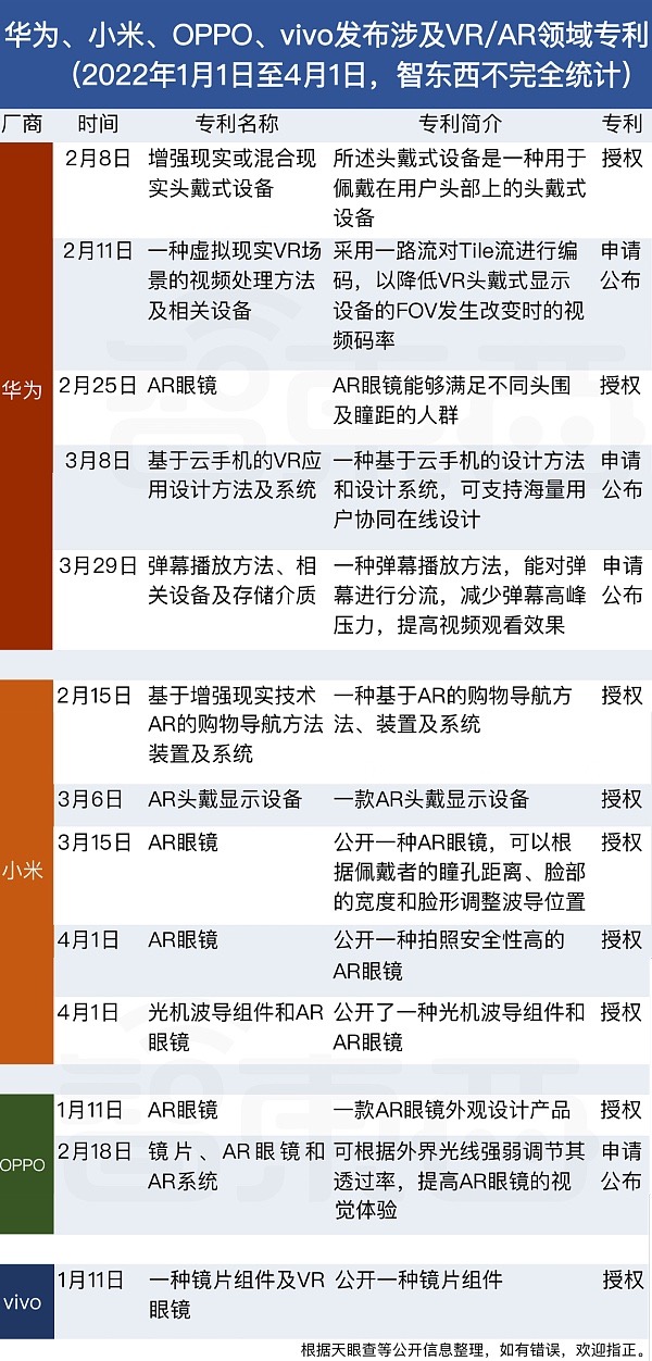 進(jìn)入2022年后,有關(guān)手機(jī)廠商造VR/AR設(shè)備新品的信息少之又少,反而不斷爆出與VR/AR設(shè)備硬件有關(guān)的專利信息。僅2022年,華為、小米、OPPO、vivo四家手機(jī)廠商就公布了13項(xiàng)與VR/AR有關(guān)的專利,涉及VR/AR基礎(chǔ)技術(shù)、外觀設(shè)計(jì)、光學(xué)顯示等多個(gè)領(lǐng)域。