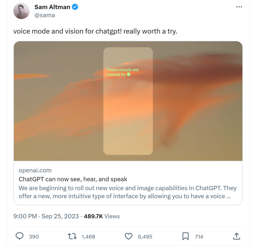 在昨晚,OpenAI CEO Sam Altman 在推特上發(fā)布了一條重要消息,ChatGPT 要推出新功能啦。ChatGPT 現(xiàn)在可以看、聽和說了!