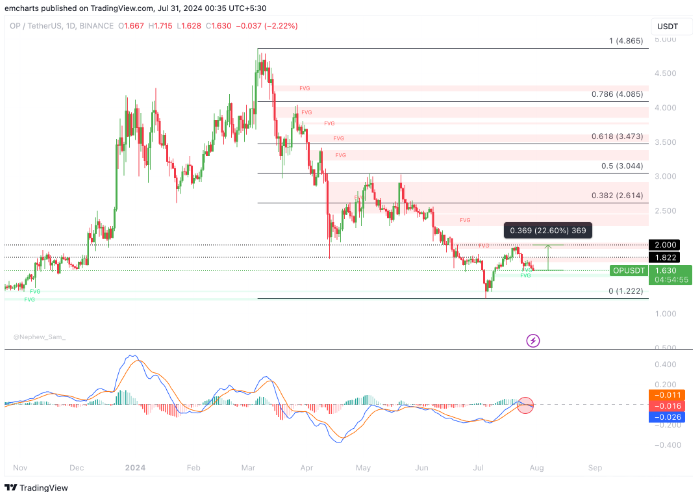 動量指標收斂/發(fā)散移動平均線(MACD)表明,OP可能會先向支撐位修正并在升至目標價位之前收集流動性。如果出現更大的回調,OP可能會在7月5日的低點1222美元處找到支撐。