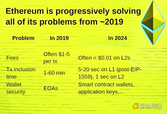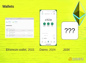錢包方面,以錢包UI為例,Ethereum2015年的錢包界面與Bitcoin高度同質化, 2024年錢包則更偏向傳統應用的使用體驗。Vitalik認為二者都不是未來錢包的范式,因為Ethereum致力于創造一種新型的基于鏈上的社會制度。