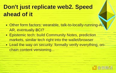 「我們要構建怎樣的應用?如何在保留所有人價值觀的基礎上構建?我不知道答案,但我認為,我們所有人、所有開發者、所有Buidler,還有社區里不可或缺的每個人,都有機會成為塑造未來的一部分。」Vitalik如是說。