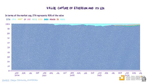 · 第一個途徑是看Ethereum是否會因為L2而損失收入。我們可以通過研究Ethereum生態收入中Ethereum的收入份額變化的來檢驗這一點。下圖是關于Ethereum和五個領先L2的收入。Ethereum一直占收入流的90%以上。