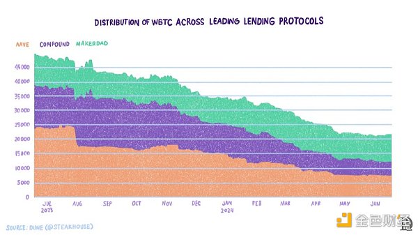 在這種設計模式下,一個集中的提供商將用戶在Bitcoin上的BTC鎖定在由托管人維護的Bitcoin地址上。BitGo的WBTC是使用最廣的BTC到其他鏈的橋接方式。使用WBTC橋接的BTC超過150k。WBTC的當前分布如下所示。
